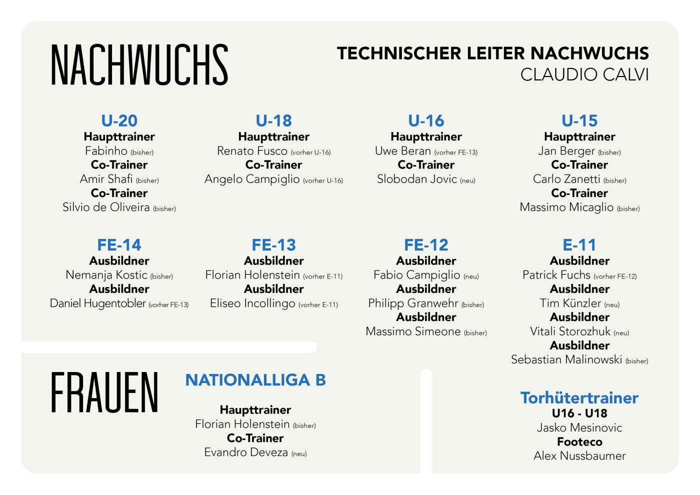 Folgend eine Übersicht der Trainer im Nachwuchs und bei den Frauen.