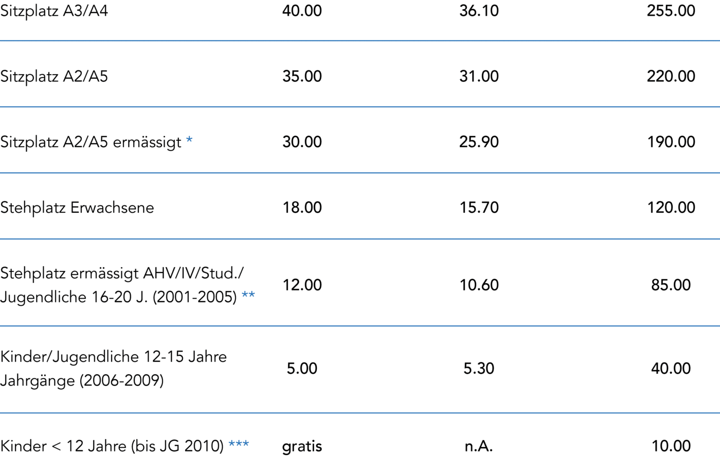* Ermässigte Preise Sitzplatz/Abo sind nur in den Sektoren A2 + A5 buchbar und gelten für AHV/IV/Kinder und Jugendliche 6-17 Jahre (Jahrgänge 2006-2017)