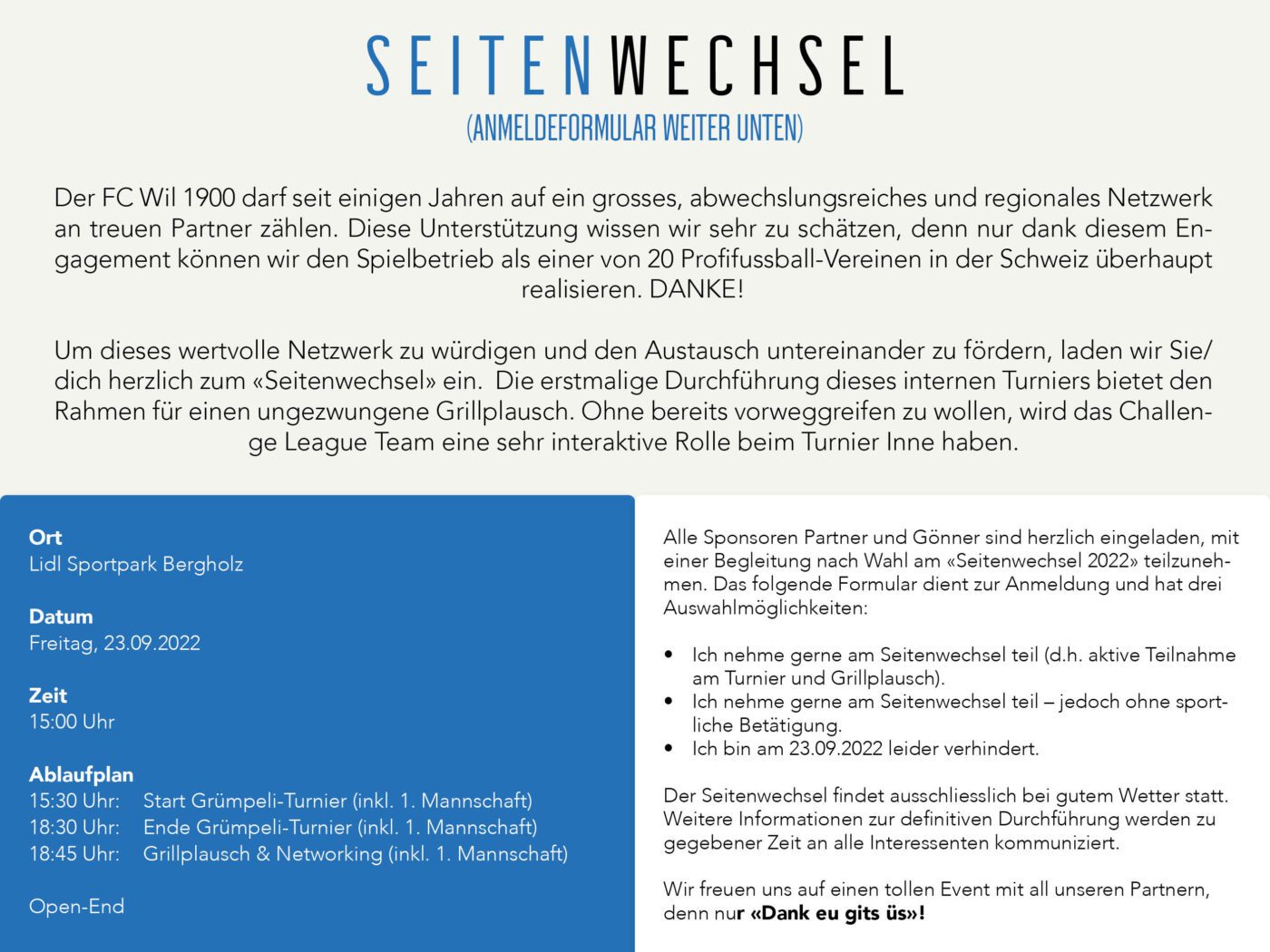 Seitenwechsel Anmeldeformular Firma (optional) E-Mail Telefon Anzahl teilnehmende Personen – Bitte auswählen –12 Vorname und Nachname Teilnehmer:in #1 Teilnehmer:in #1 – Bitte auswählen –Ich nehme gerne am Seitenwechsel teil (d.h. aktive Teilnahme am Turnier und Grillplausch).Ich nehme gerne am Seitenwechsel teil – jedoch ohne sportliche Betätigung.Ich bin am 23.09.2022 leider verhindert. Vorname und Nachname Teilnehmer:in #2 Teilnehmer:in #2 – Bitte auswählen –Ich nehme gerne am Seitenwechsel teil (d.h. aktive Teilnahme am Turnier und Grillplausch).Ich nehme gerne am Seitenwechsel teil – jedoch ohne sportliche Betätigung.Ich bin am 23.09.2022 leider verhindert. Bitte den Button "Senden" nicht mehrmals anklicken. Es kann einige Sekunden dauern bis das Formular abgesendet wurde.